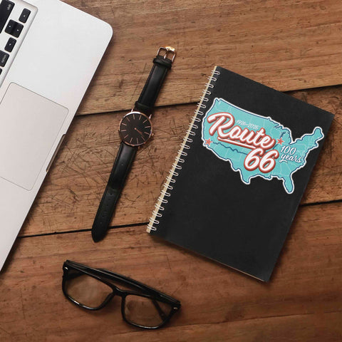 Vintage 100th Anniversary Route 66 map sticker, 4.5" wide laptop decal or bumper sticker size. Waterproof vinyl decal for indoor & outdoor use. Made in USA.