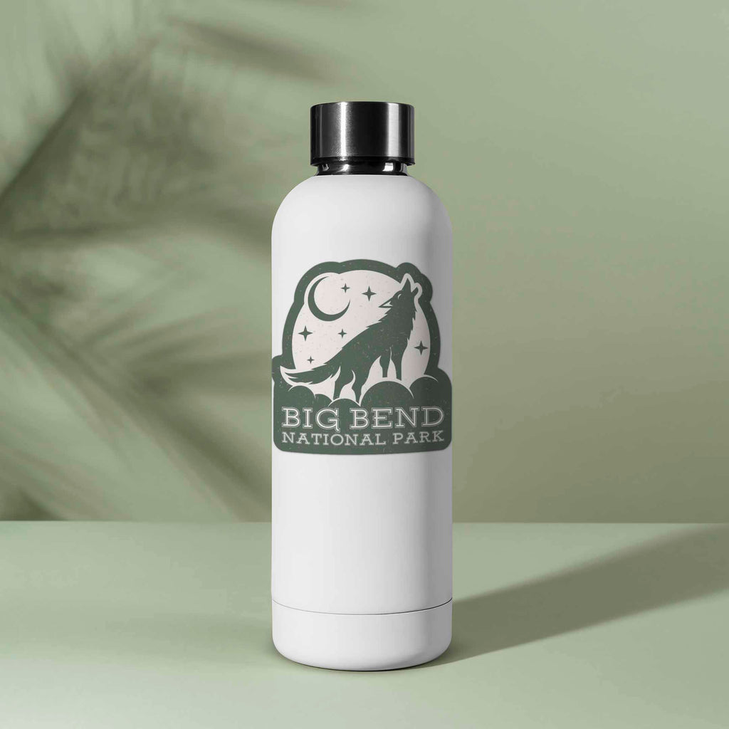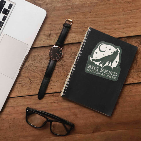 Coyote Moon Big Bend National Park sticker,: 3.5" wide laptop decal or bumper sticker size. Waterproof vinyl decal for use indoors & outdoors. Made in USA.