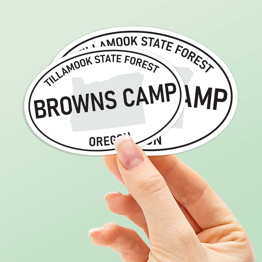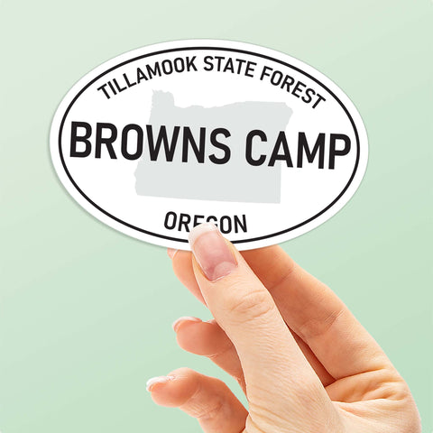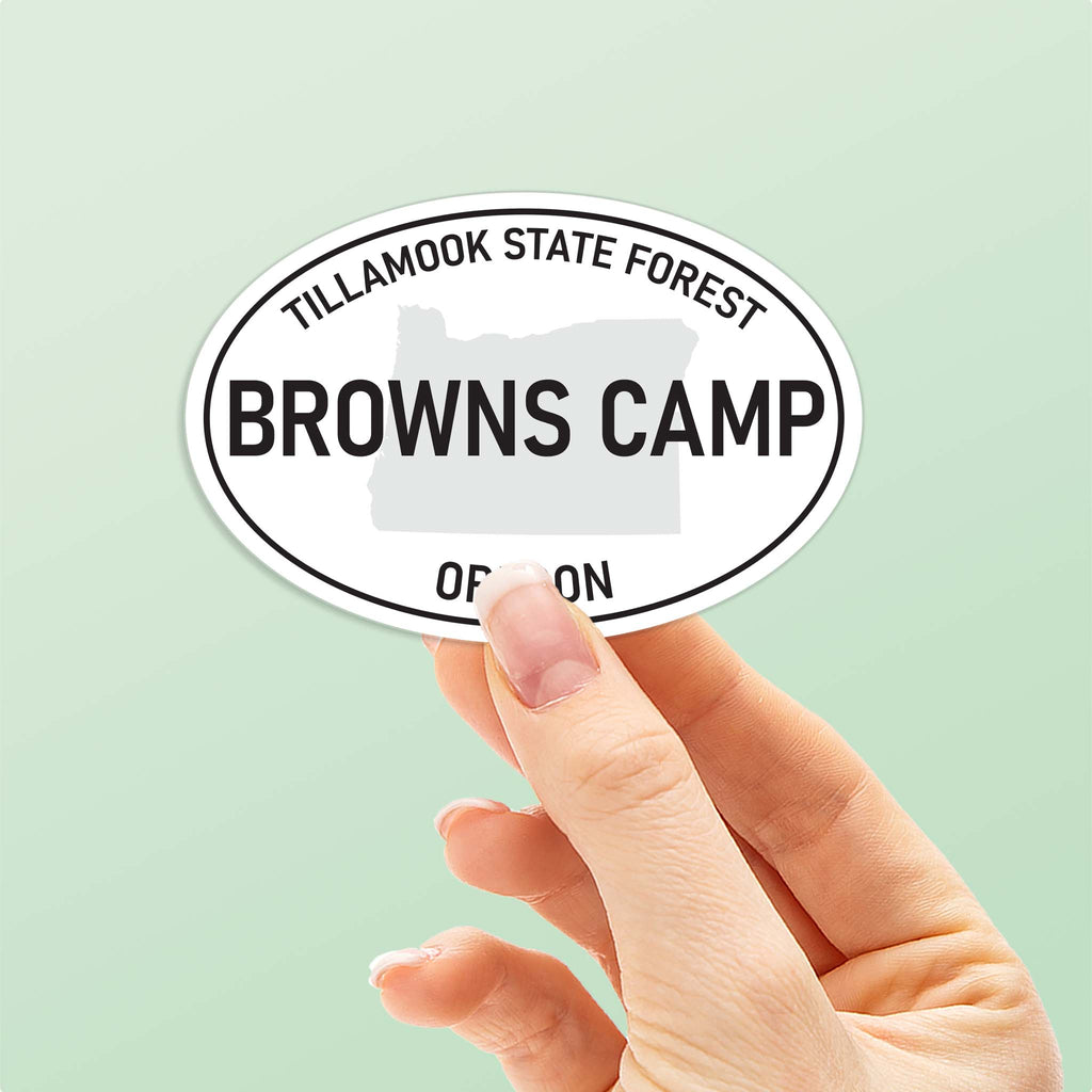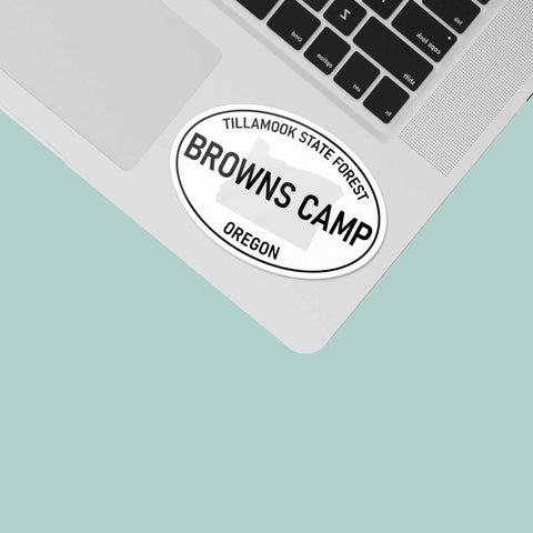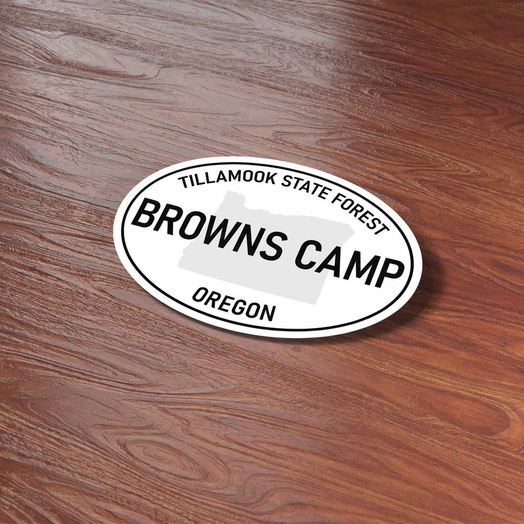 White oval Browns Camp Oregon stickers, 2 sizes: 3" wide laptop decal or 4" bumper sticker size. Waterproof vinyl decal for indoor & outdoor use. Made in USA.