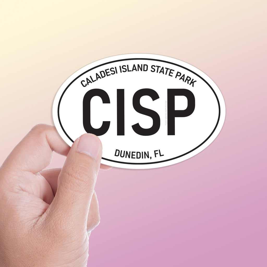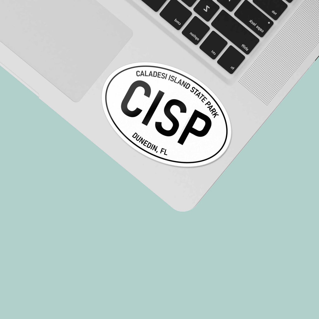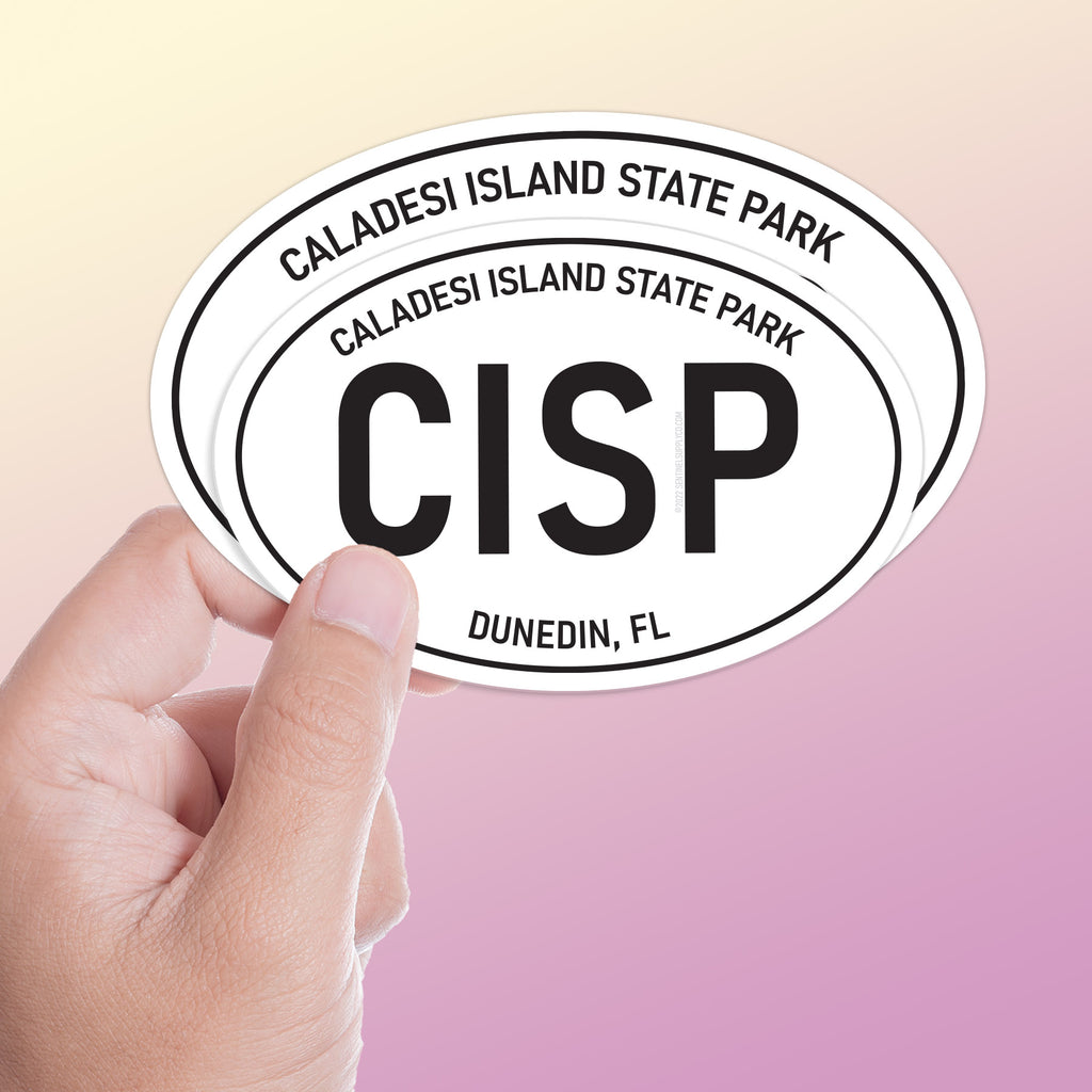 White oval Caladesi Island Florida stickers, 2 sizes: 3" wide laptop decal or 4" wide bumper sticker size. Waterproof vinyl decal for indoor & outdoor use. Made in USA.