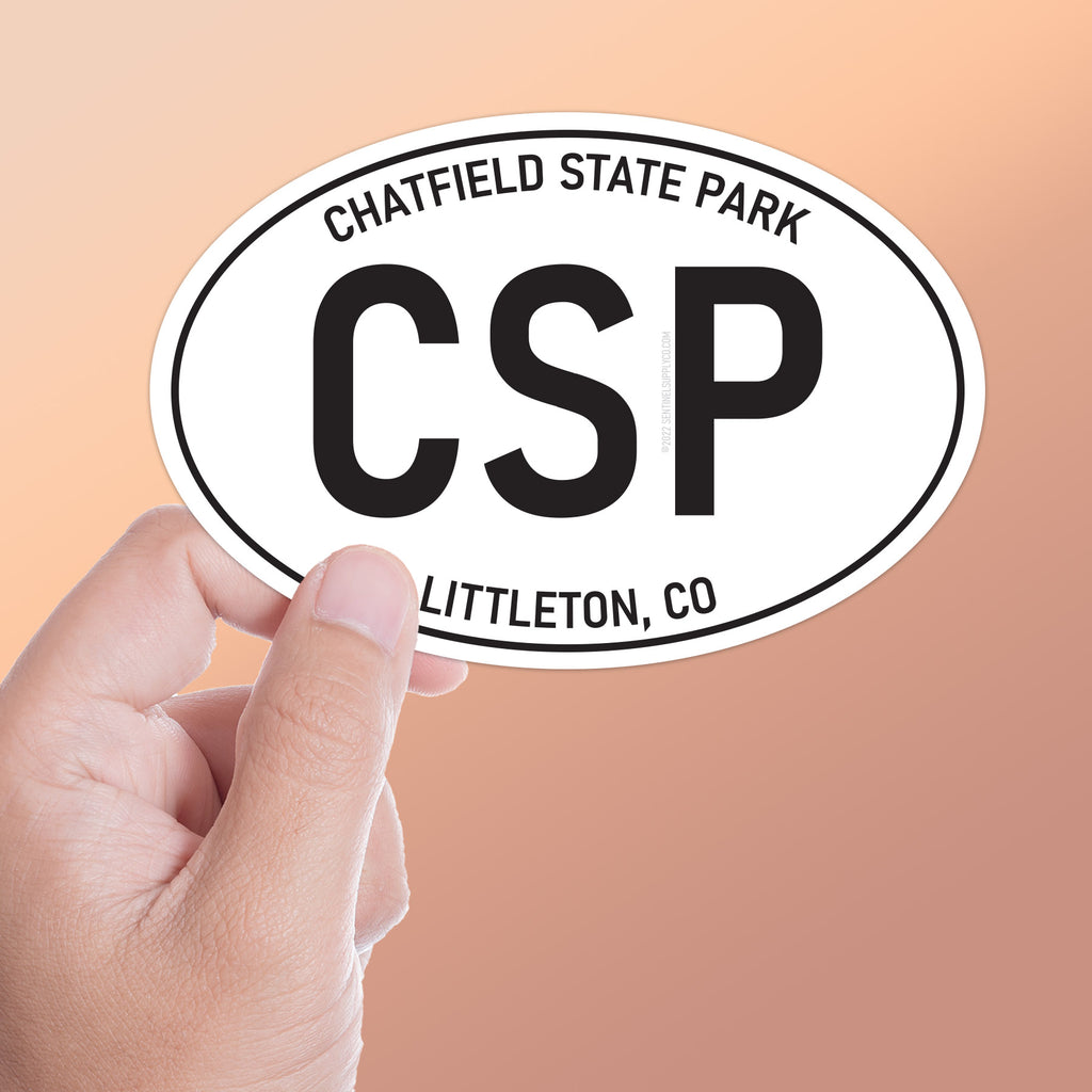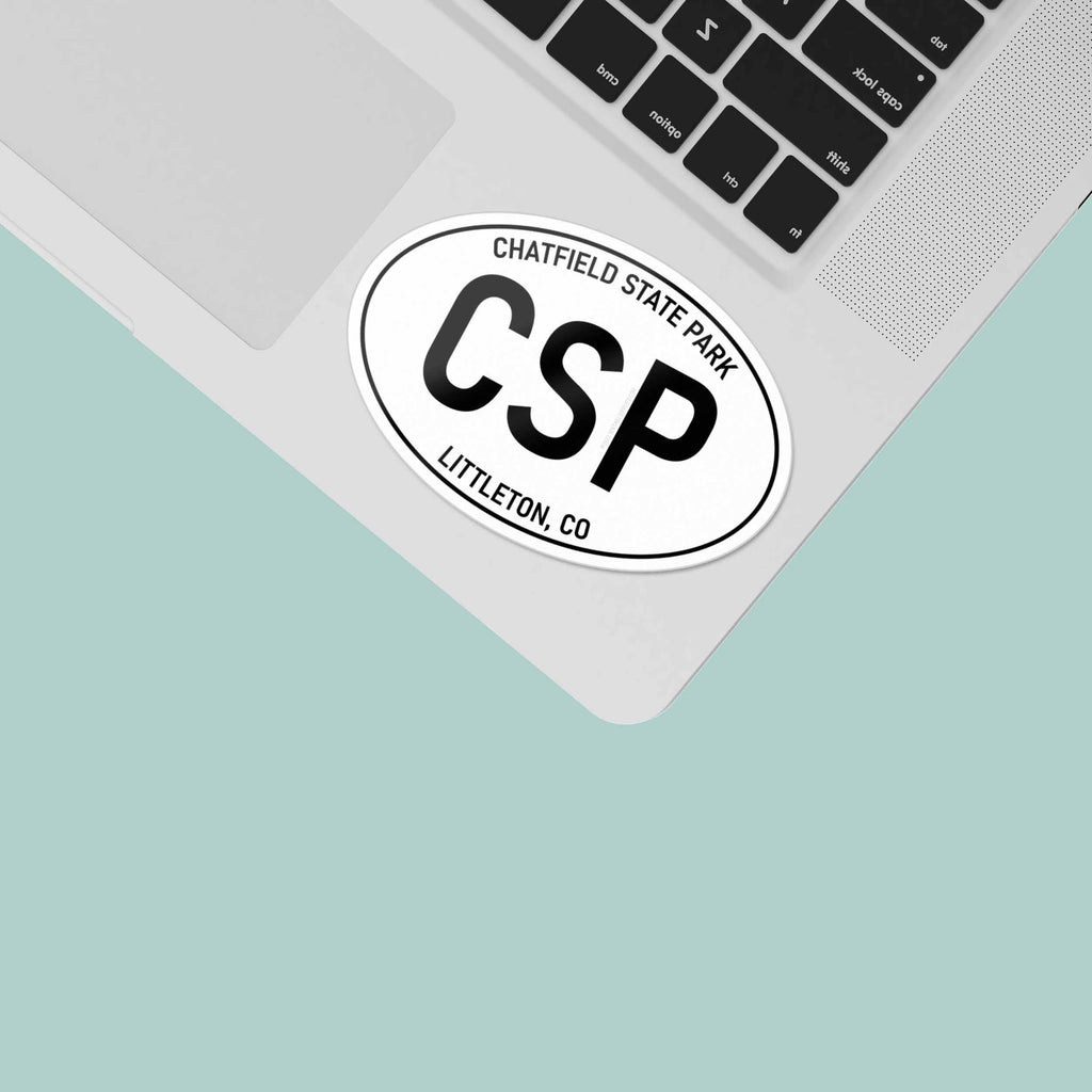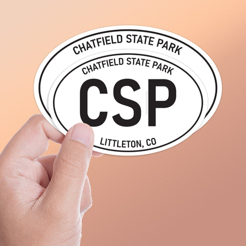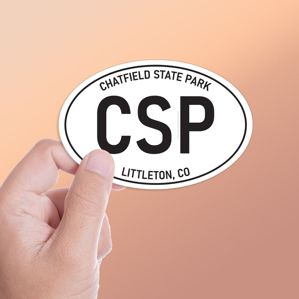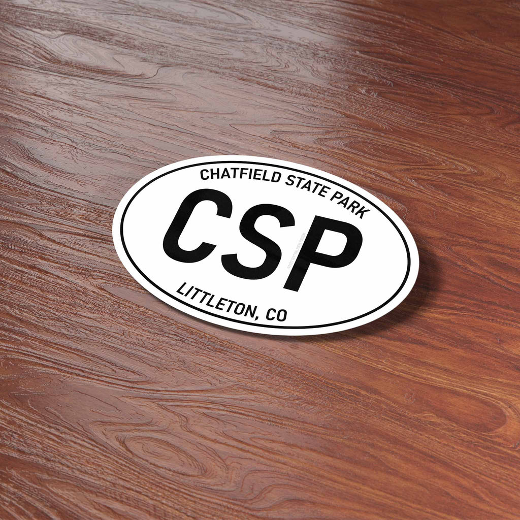 White oval Chatfield State Park Colorado stickers, 2 sizes: 3" wide laptop decal or 4" wide bumper sticker size. Waterproof vinyl decal for indoor & outdoor use. Made in USA.
