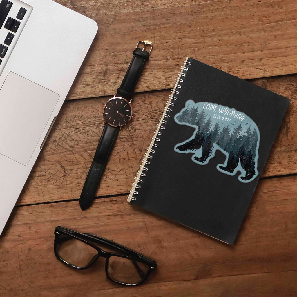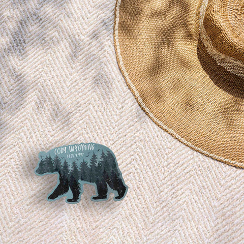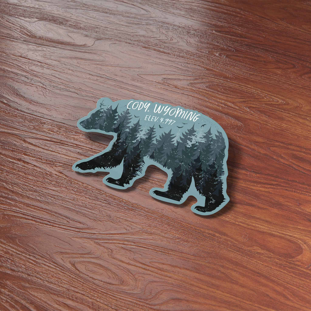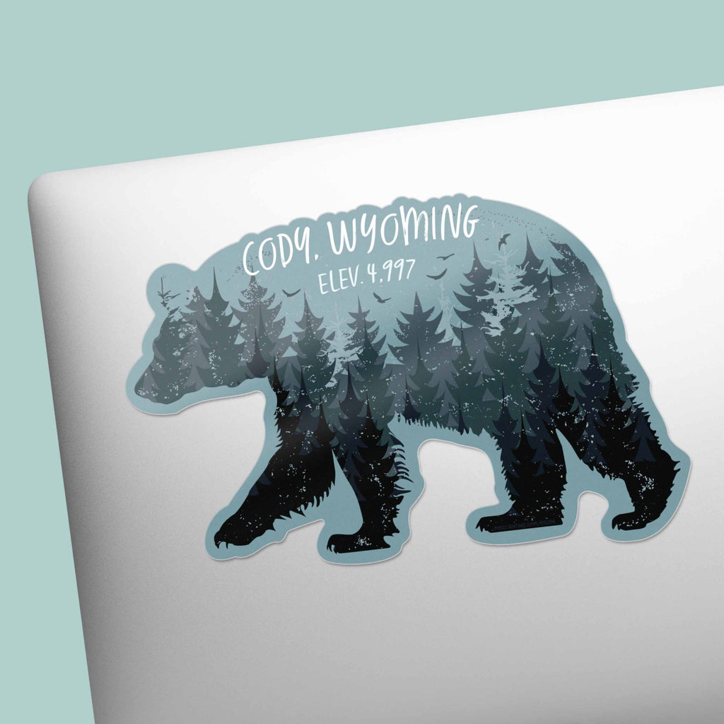 Cody Wyoming bear sticker, 5" bumper sticker or large laptop decal size. Waterproof vinyl decal for indoor & outdoor use. Made in USA.