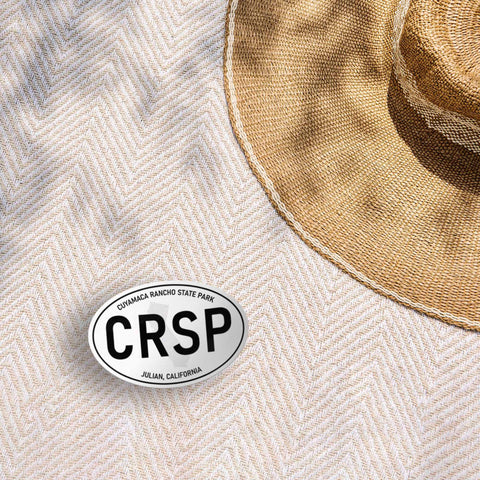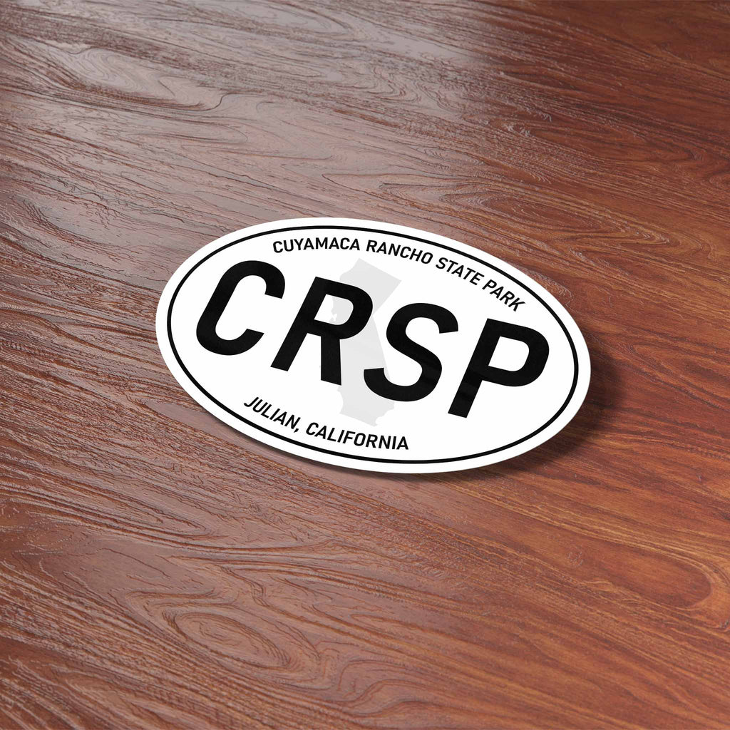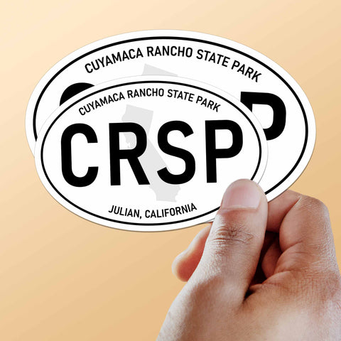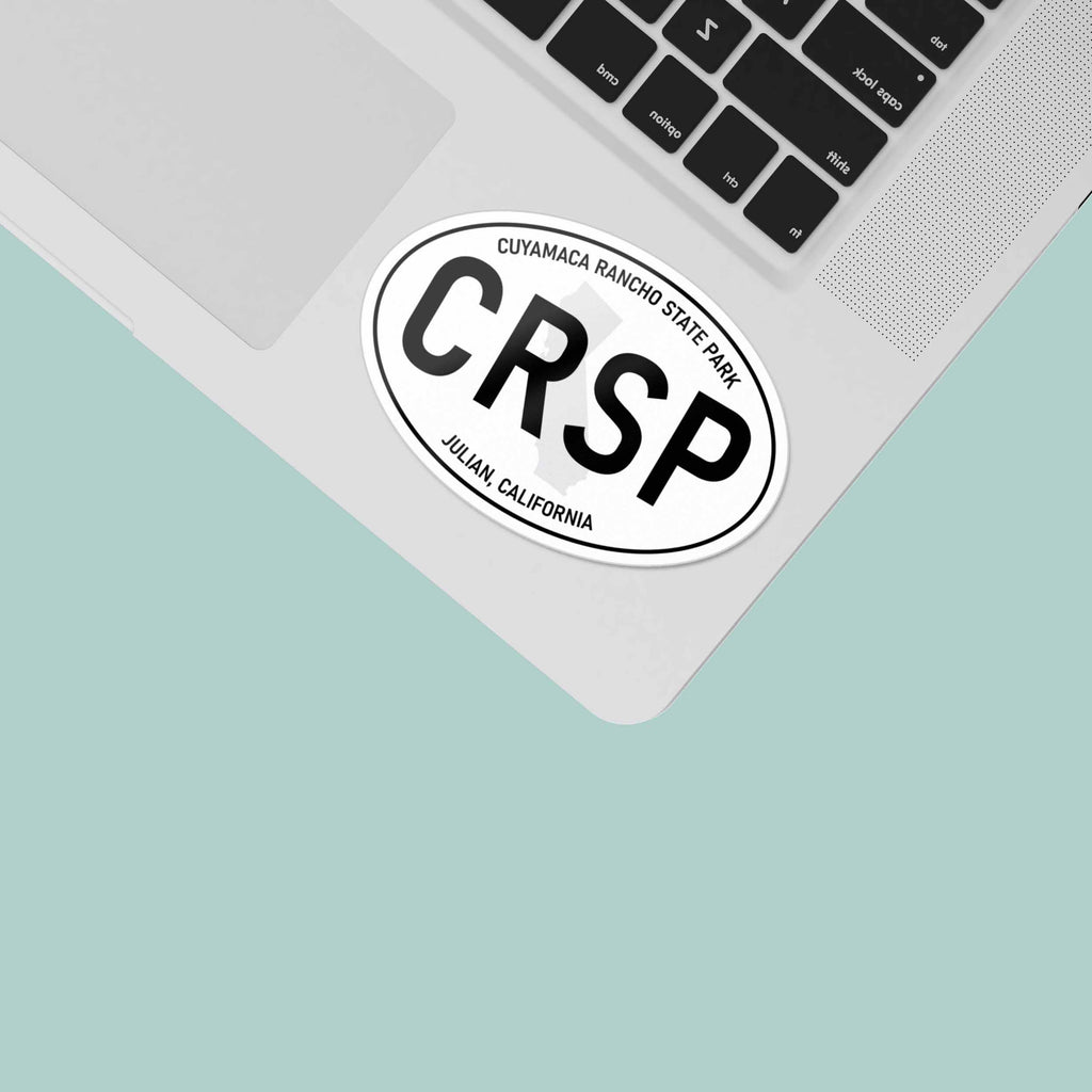 Cuyamaca Rancho State Park white oval sticker, 2 sizes: 3" wide laptop decal & 4" bumper sticker size. Waterproof vinyl decal for indoor & outdoor use.