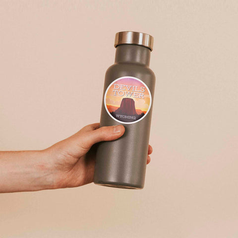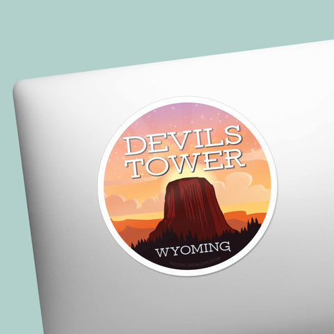 Looming over the Wyoming prairie and the edges of South Dakota's Black Hills, Devils Tower is a striking geological formation that can be seen for miles. Celebrate your adventures out west with a sunset colored Devils Tower sticker.