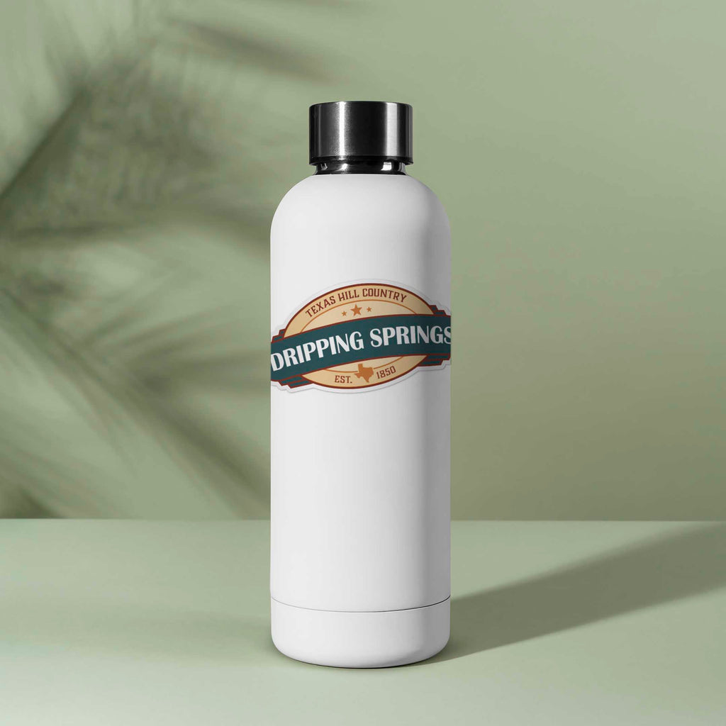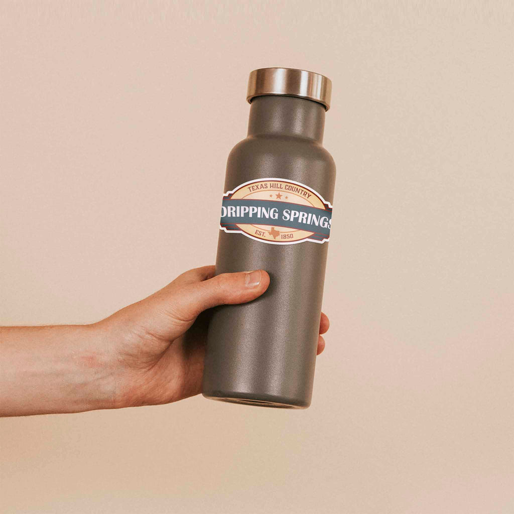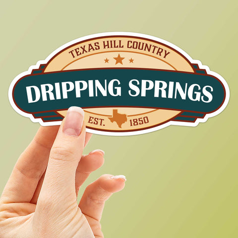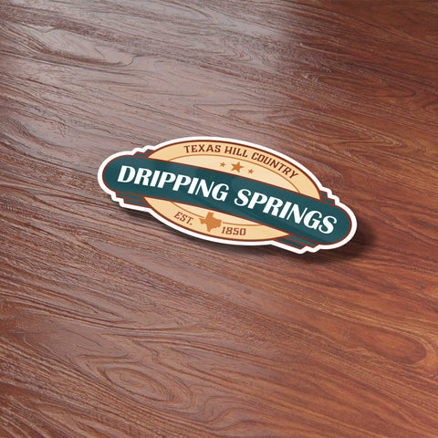 Dripping Springs Texas bumper sticker, 4" wide laptop sticker or car decal size. Waterproof vinyl decal for indoor & outdoor use. Made in USA.
