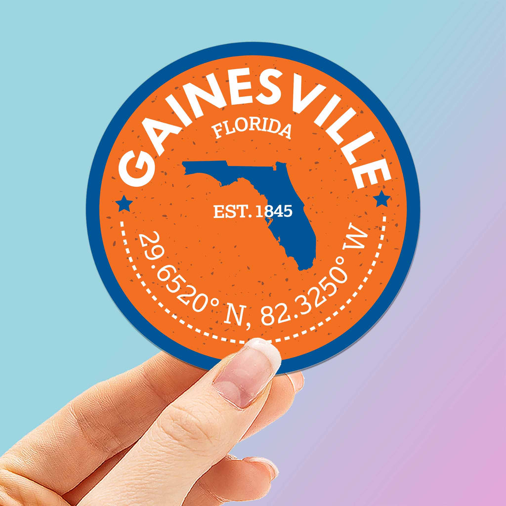 Celebrate your adventures in the Sunshine State with a cute Gainesville Florida sticker featuring the state map and a blue and orange color palette. Makes a great North Florida vacation souvenir or a cool gift for college students or university alumni.