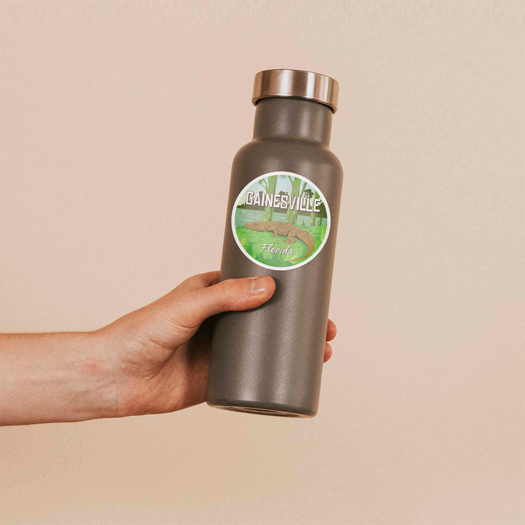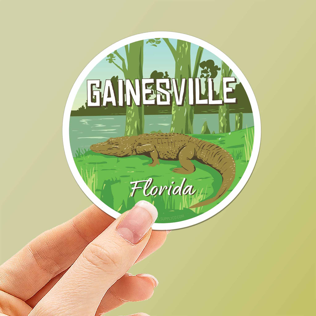 Celebrate the Sunshine State with a cute Gainesville Florida sticker featuring a gator chilling in the swamp. Makes a great North Florida vacation souvenir or a cool gift for college students, alumni, and nature lovers.