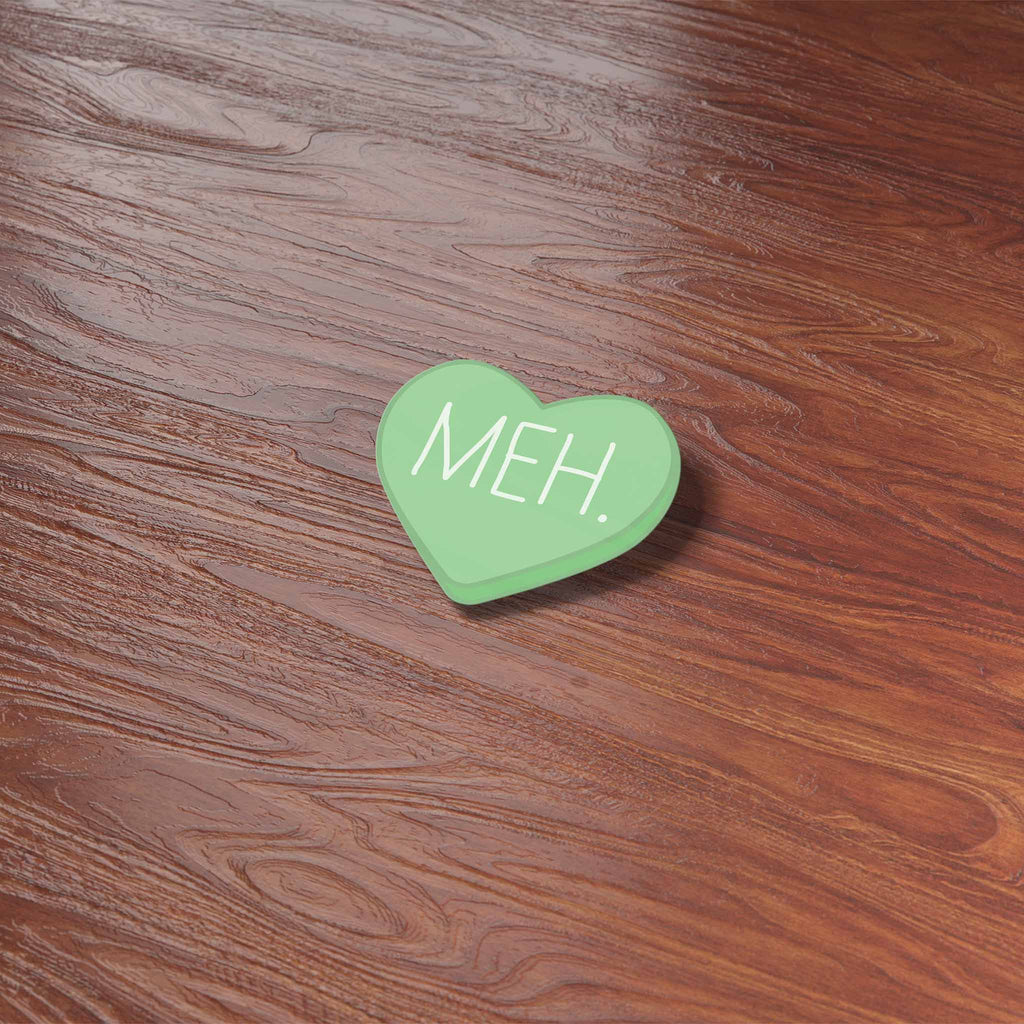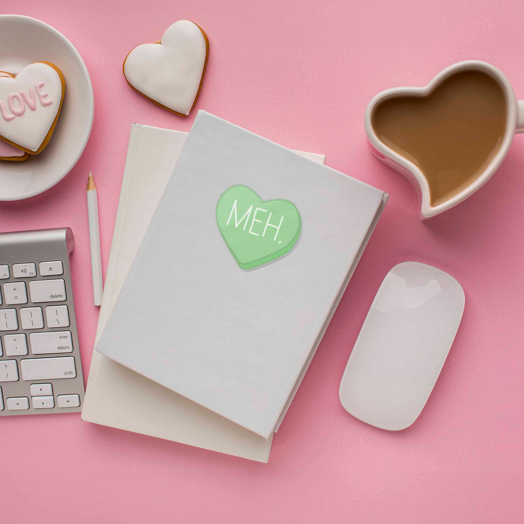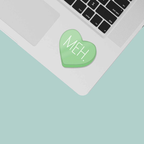 Meh funny candy heart sticker, mini 2" wide laptop decal or water bottle sticker size. Waterproof vinyl decal for indoor & outdoor use. Made in USA.