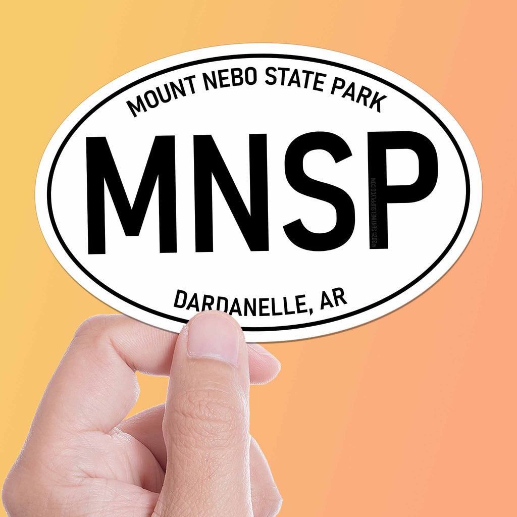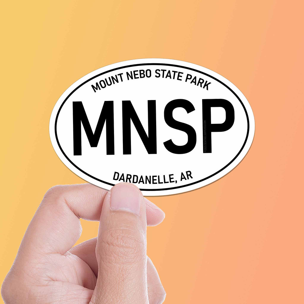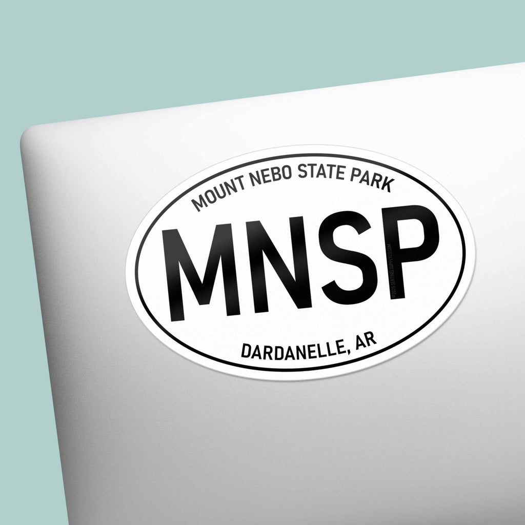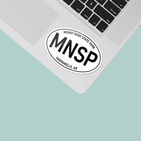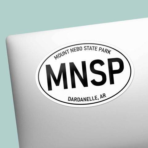 Standing at 1,350ft, Mount Nebo offers unparalleled views of the Arkansas River Valley and Lake Dardanelle. Whether you're camping, hang-gliding from Sunrise or Sunset point, learning history at the visitor center, Mount Nebo State Park is a must-see Arkansas gem. Celebrate your adventures in the Natural State with a MNSP decal in black and white oval Euro sticker style.