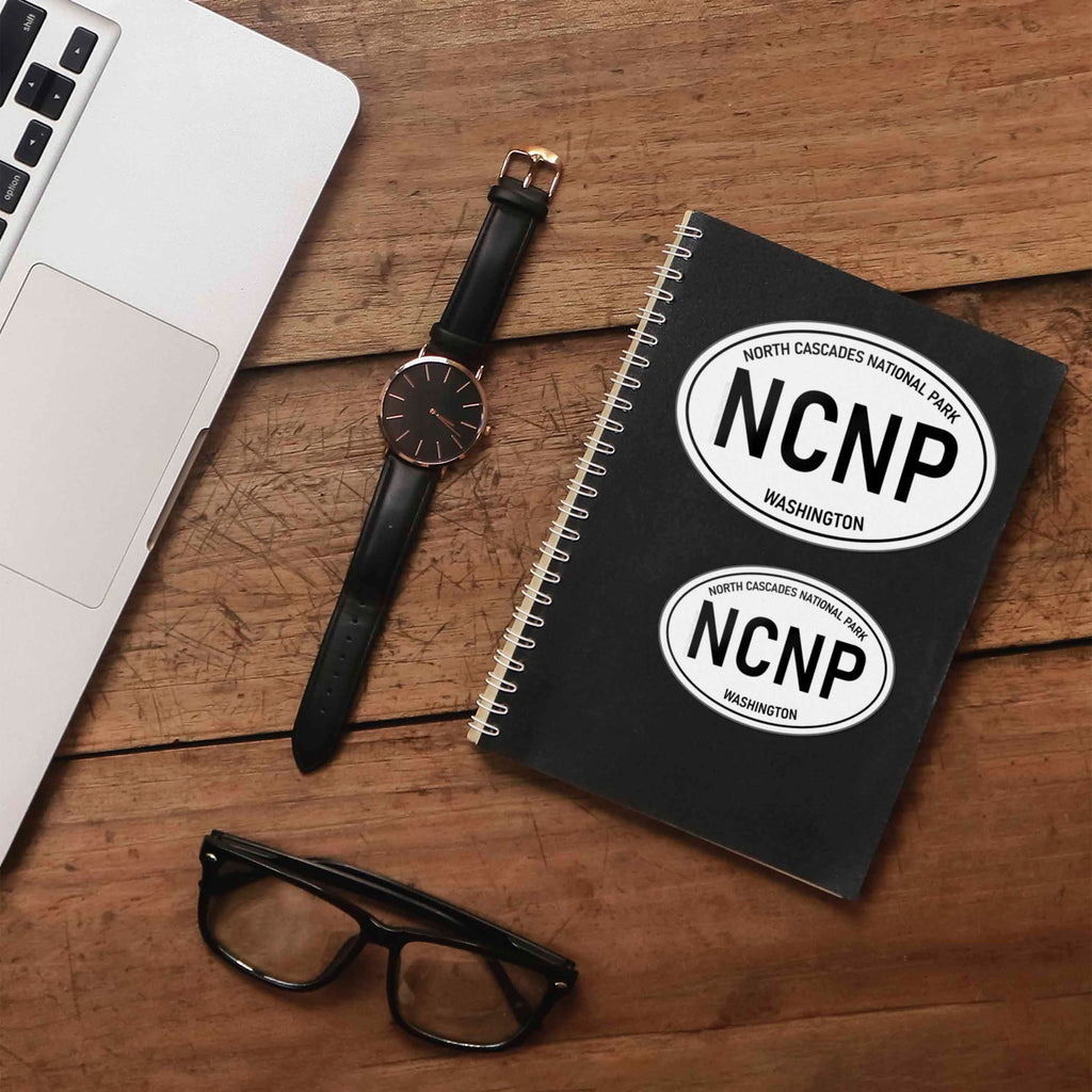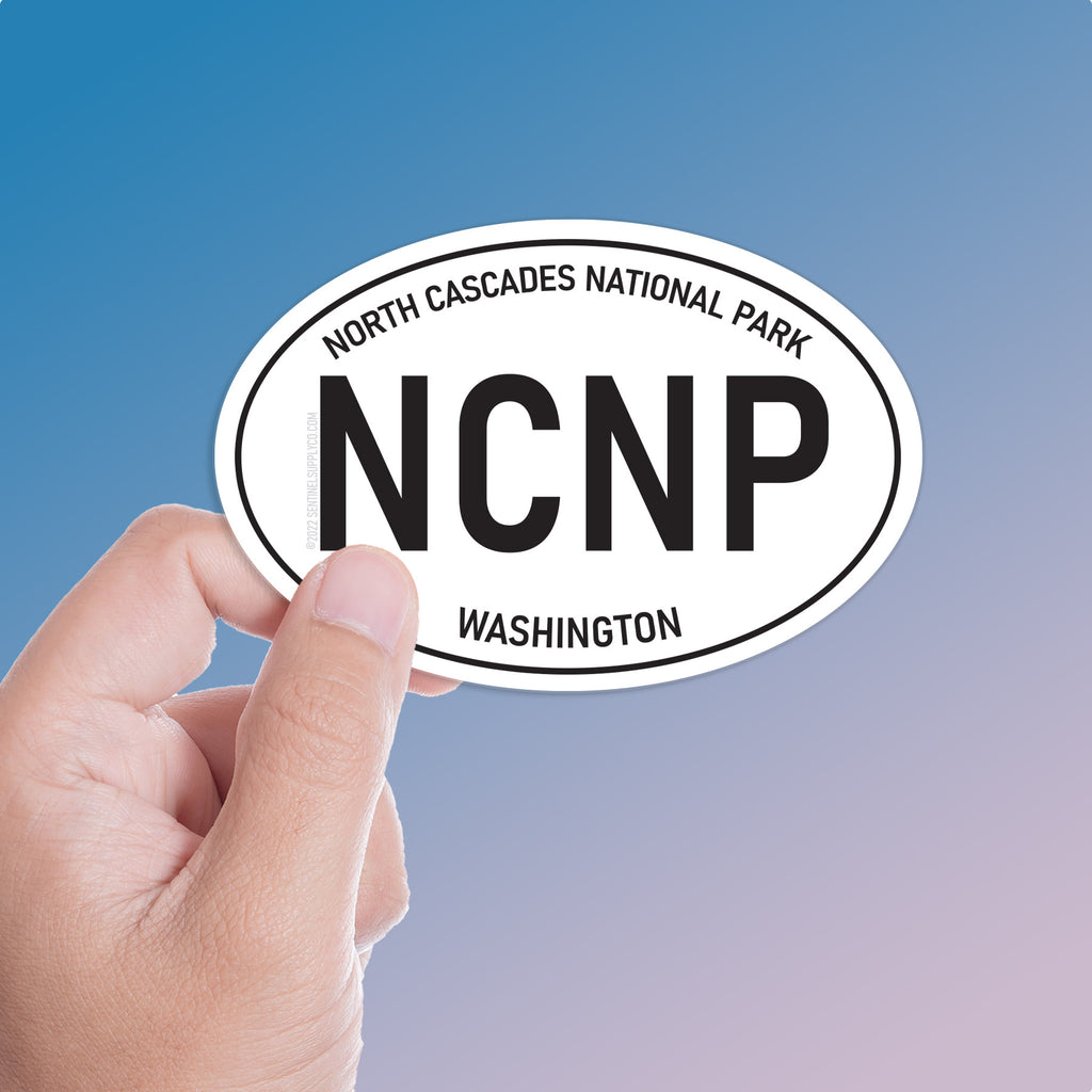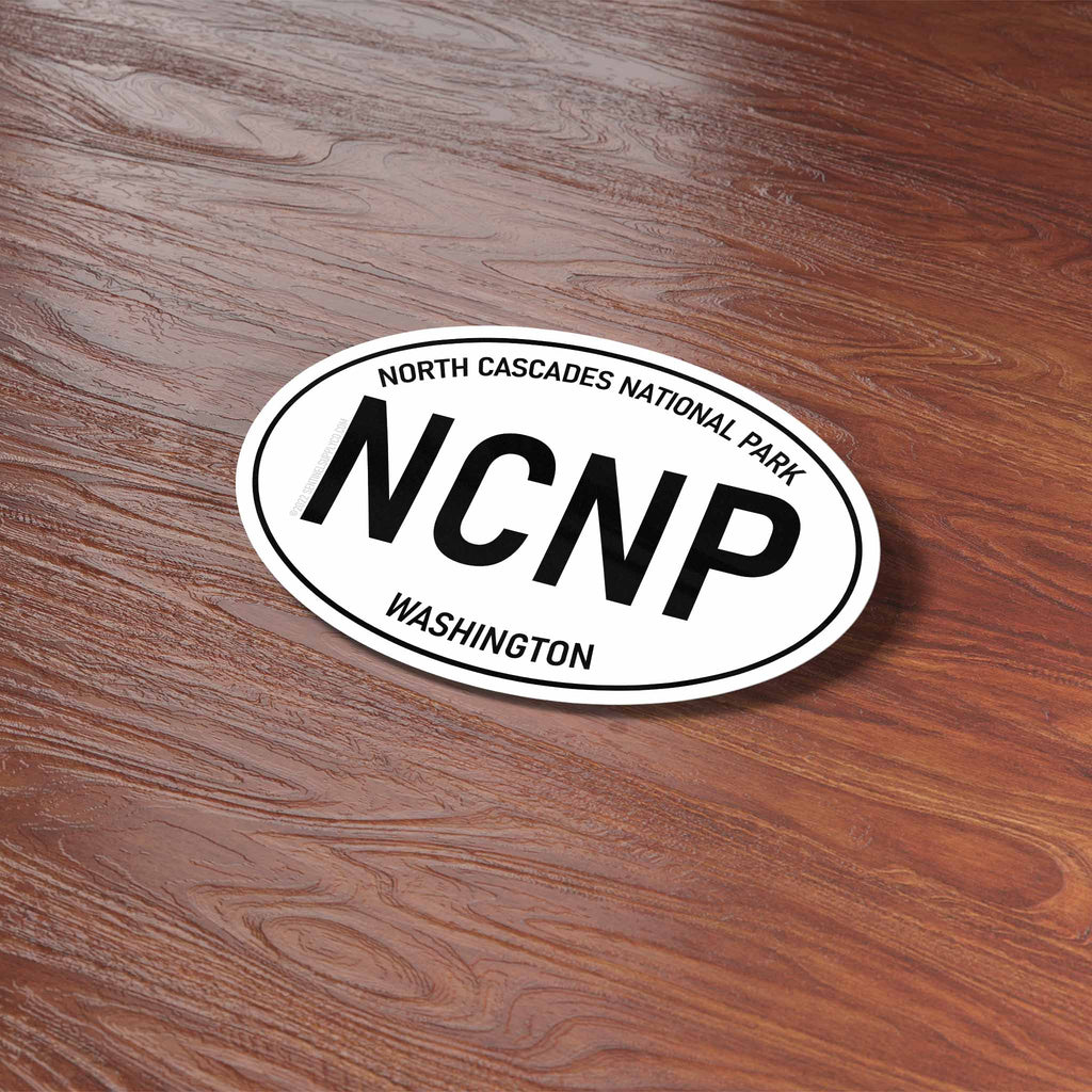 White oval North Cascades National Park stickers, 2 sizes: 3" wide laptop decal or 4" wide bumper sticker size. Waterproof vinyl decal for indoor & outdoor use. Made in USA.