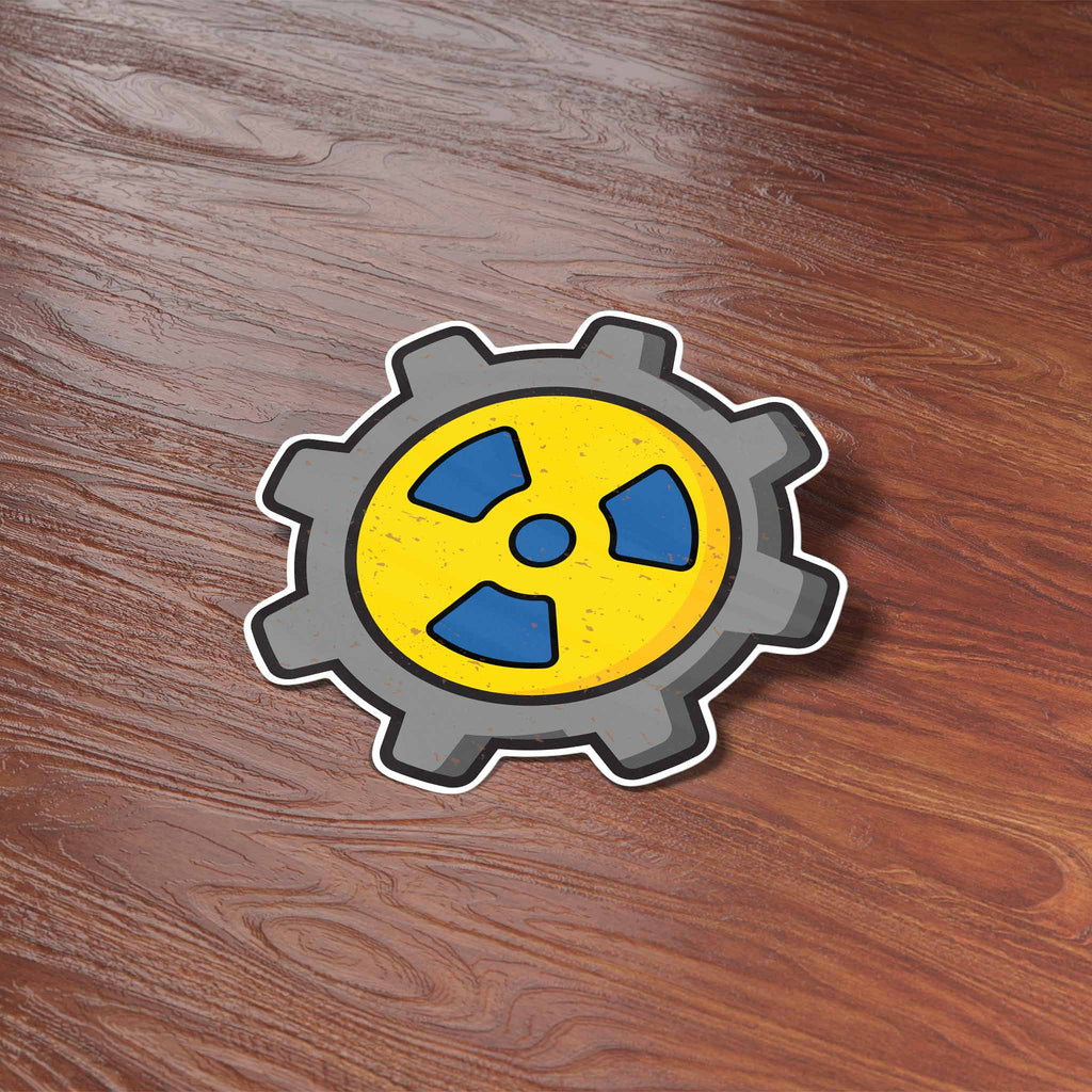 Radioactive gear video game sticker, 3" wide laptop decal or small bumper sticker size. Waterproof vinyl decal for indoor & outdoor use. Made in USA.