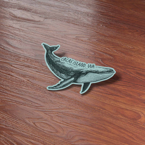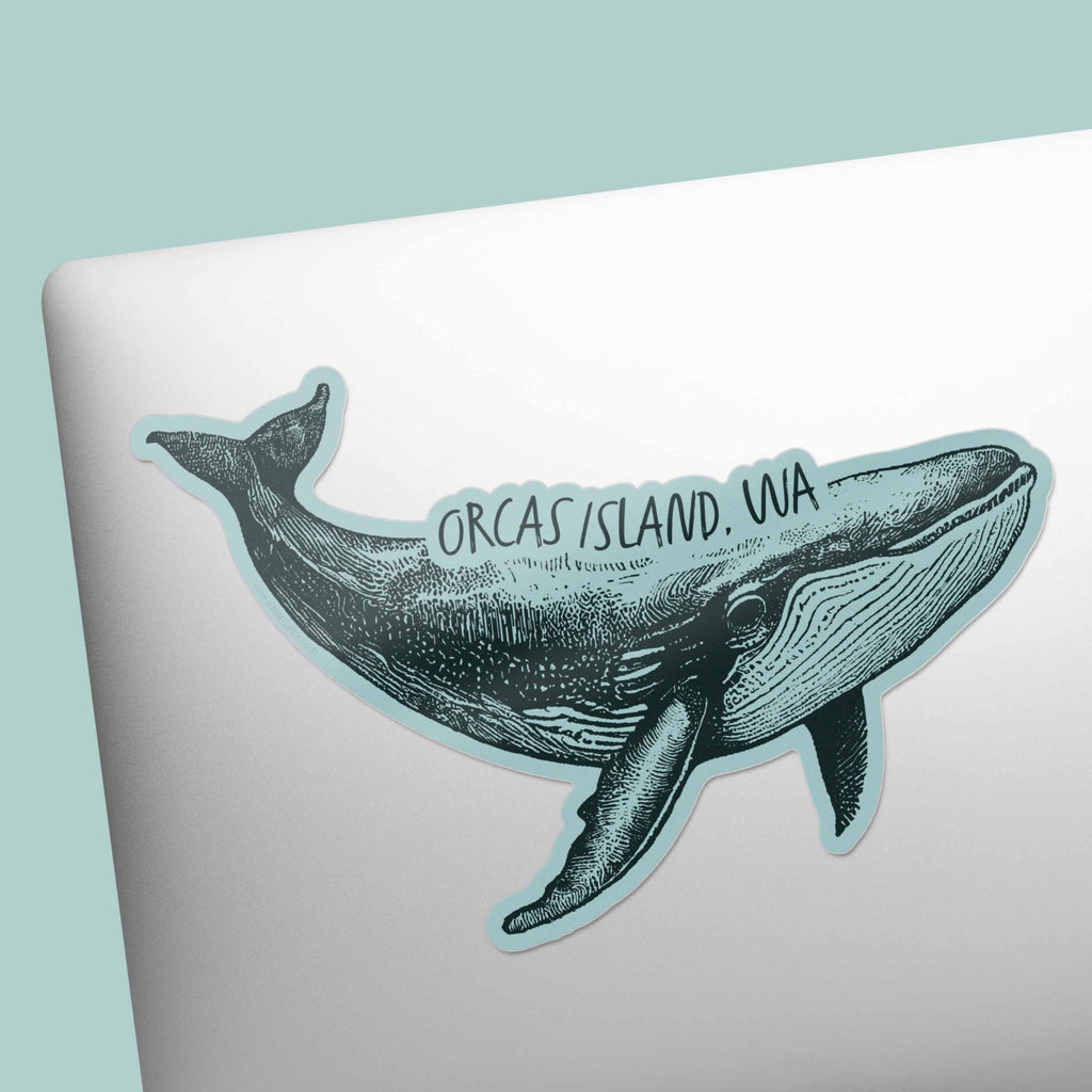 Orcas Island WA humpback whale sticker, 5" wide bumper sticker or large laptop decal size. Waterproof vinyl decal for indoor & outdoor use. Made in USA.
