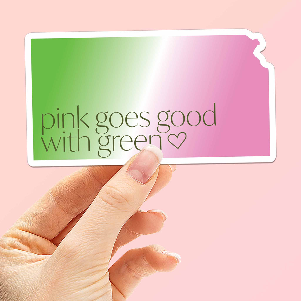 Pink Goes Good with Green Kansas Movie Sticker sticker for water bottle, 3.5" wide laptop decal or small bumper sticker size. Waterproof die-cut vinyl decal for indoor & outdoor use. Made in USA.