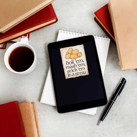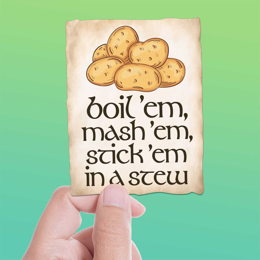 Potatoes? Boil 'em, mash 'em, stick 'em in a stew! Perfect for second breakfast. Show your love for the cozy hobbit life with a funny movie quote sticker from the iconic Samwise Gamgee.