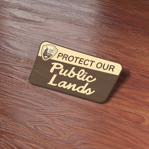Protect Our Public Lands sticker, 3.25" wide laptop decal or bumper sticker size. Waterproof vinyl decal for indoor & outdoor use. Made in USA.