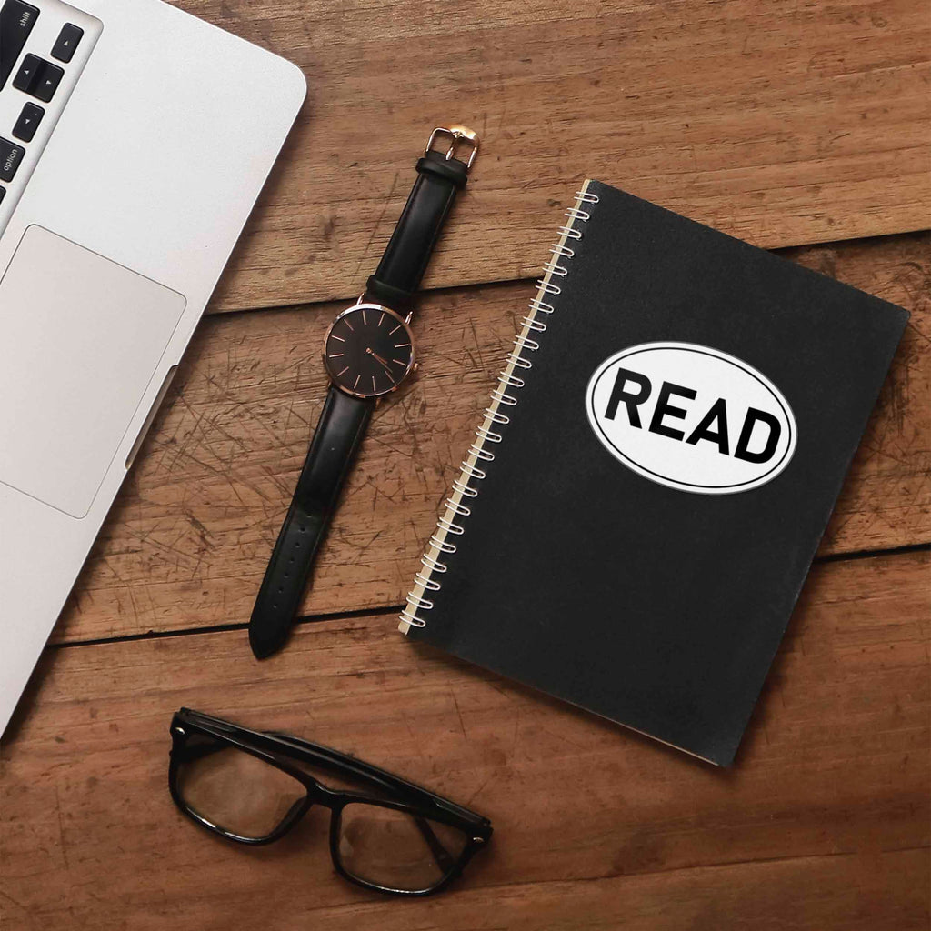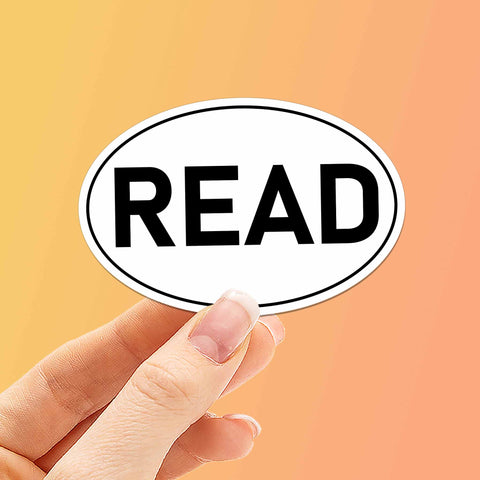 Read white oval car decal, 2 sizes: 3" laptop decal or 4" bumper sticker size. Durable die-cut vinyl decal with matte UV-resistant coating. Waterproof & weatherproof for indoor & outdoor use. Made in USA.