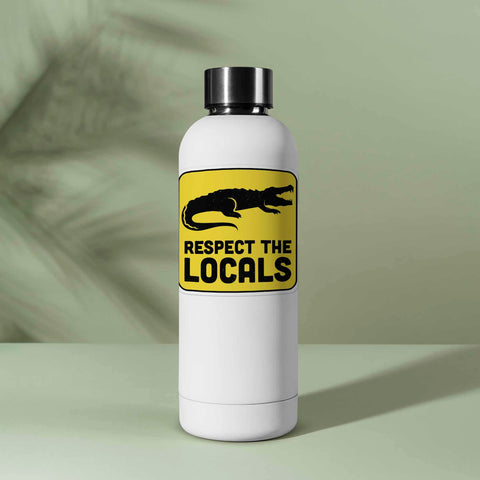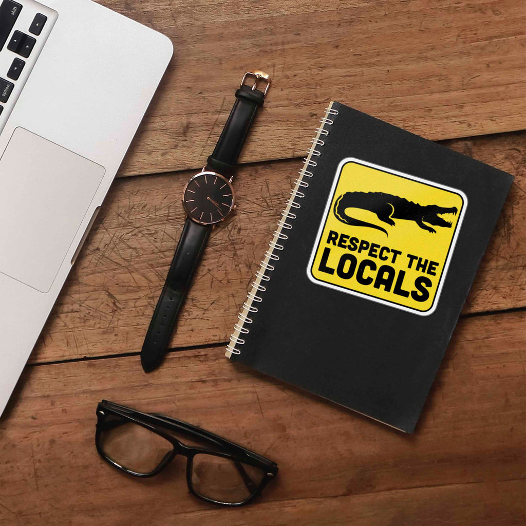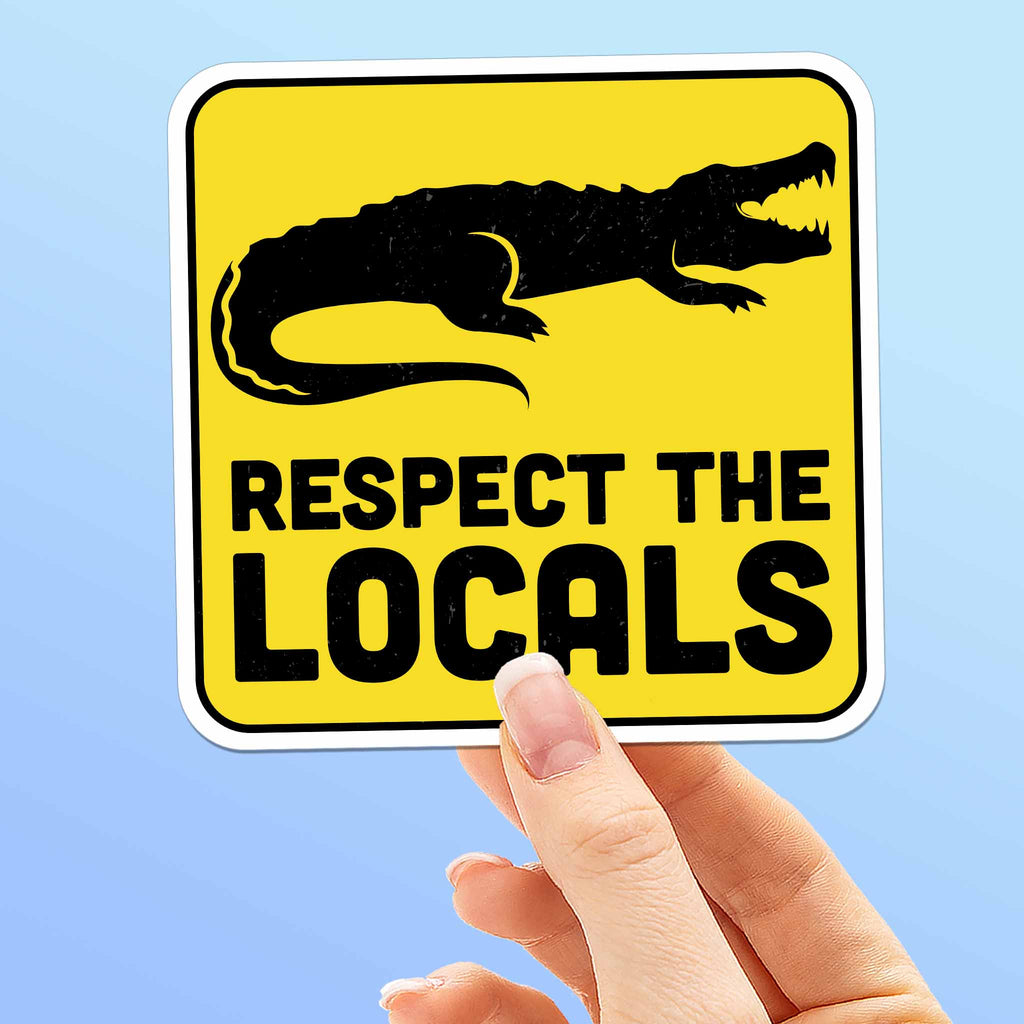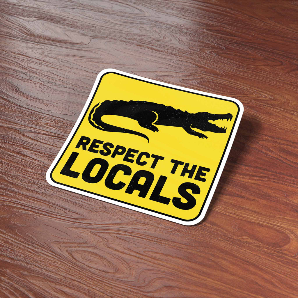 Respect the Locals alligator sticker, 3.5" wide laptop decal or bumper sticker size. Waterproof vinyl decal for indoor & outdoor use. Made in USA.