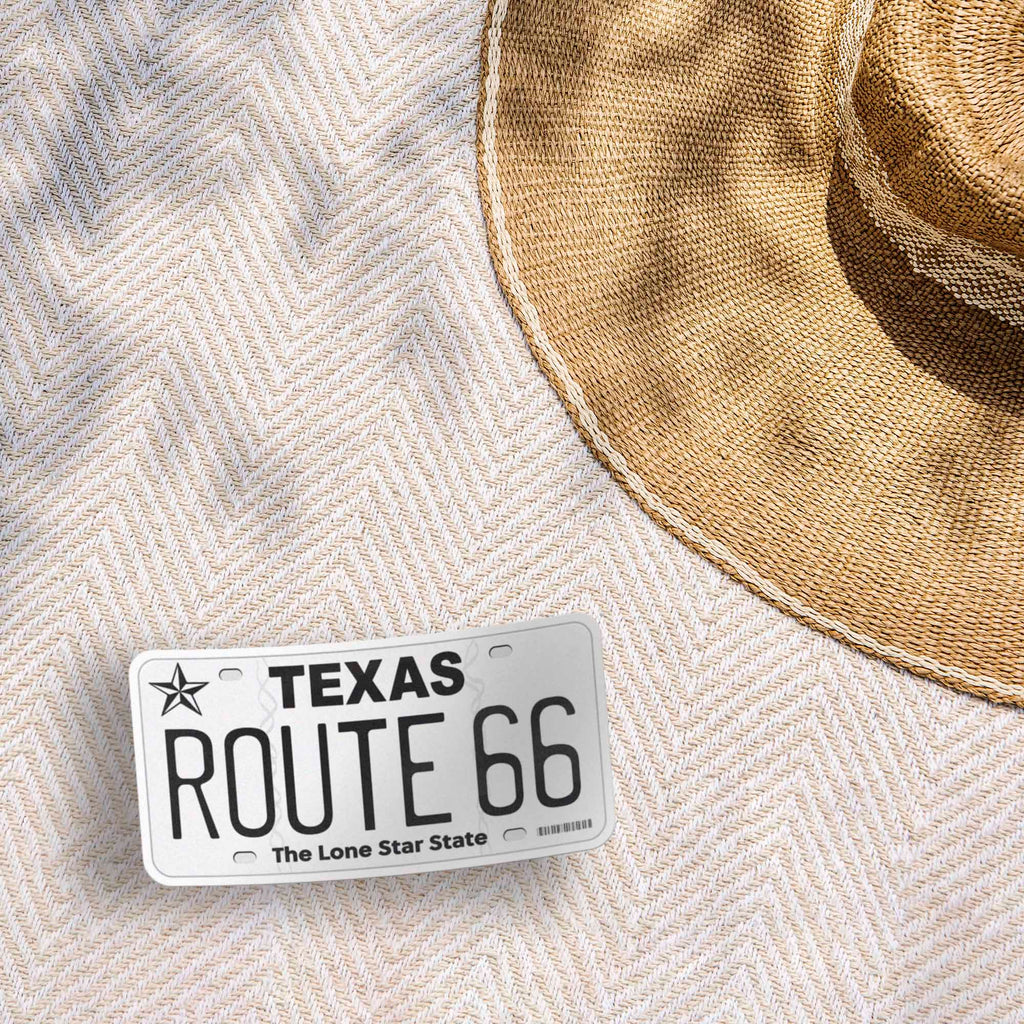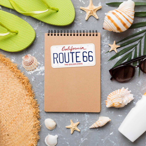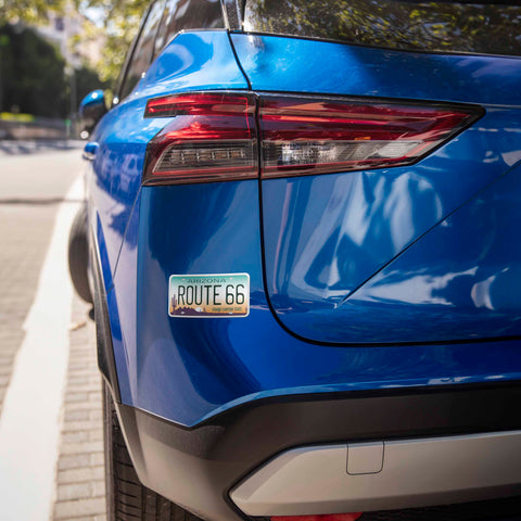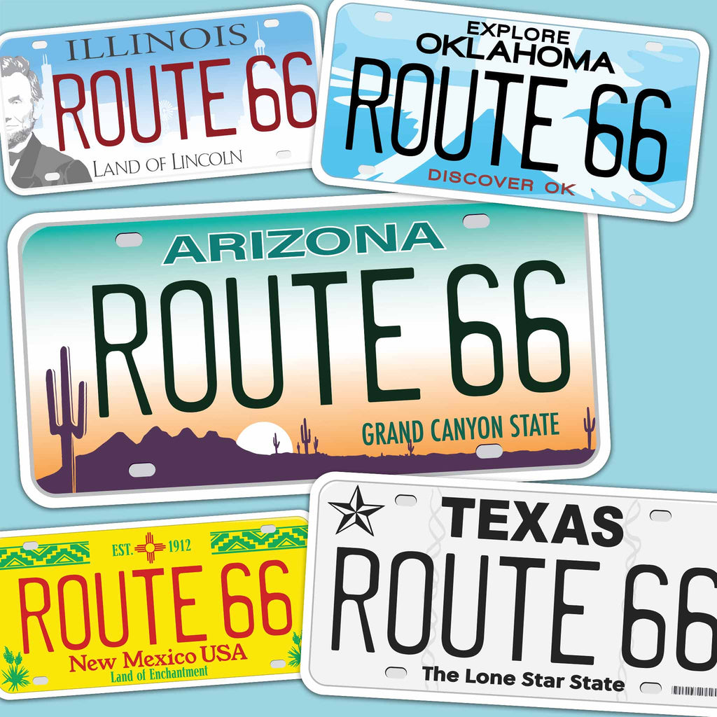 8 State License Plate Route 66 stickers, 4" wide laptop decal or bumper sticker size. Waterproof vinyl decal for indoor & outdoor use. Made in USA.