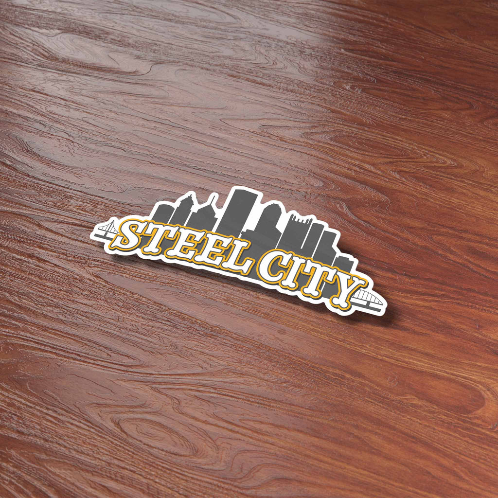 Pittsburgh Steel City sticker, 4" wide laptop decal or bumper sticker size. Waterproof vinyl decal for indoor & outdoor use. Made in USA.