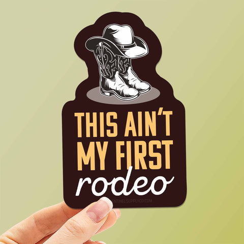 This Ain't My First Rodeo bumper sticker, 4" tall water bottle & laptop decal size. Waterproof vinyl decal for indoor & outdoor use. Made in USA.