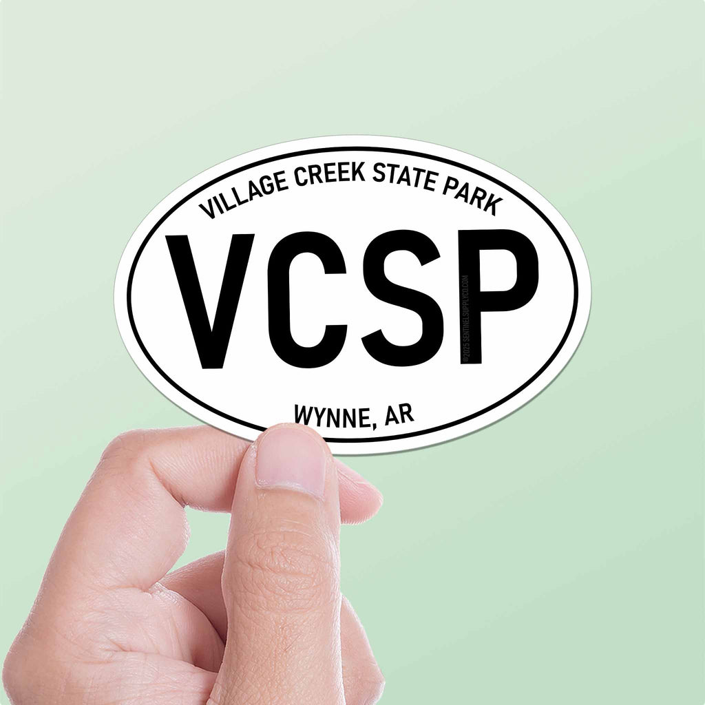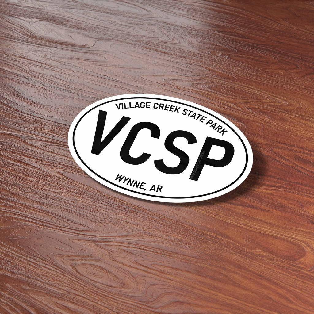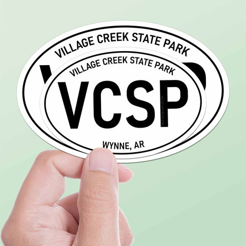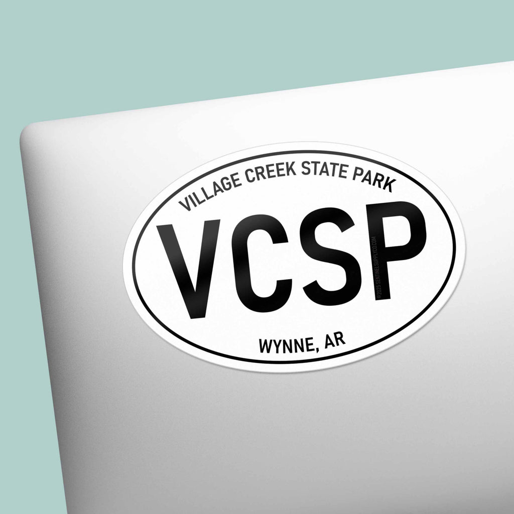 In the unique geology of Crowley's Ridge, Village Creek State Park offers a tranquil retreat in the Arkansas countryside. Whether you're horseback riding through the hardwood forests, boating on the lakes and rivers, or golfing at The Ridges, this park is a true treasure for outdoor enthusiasts. Celebrate your adventures in the Natural State with a VCSP decal in black and white oval Euro sticker style.