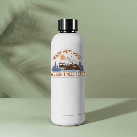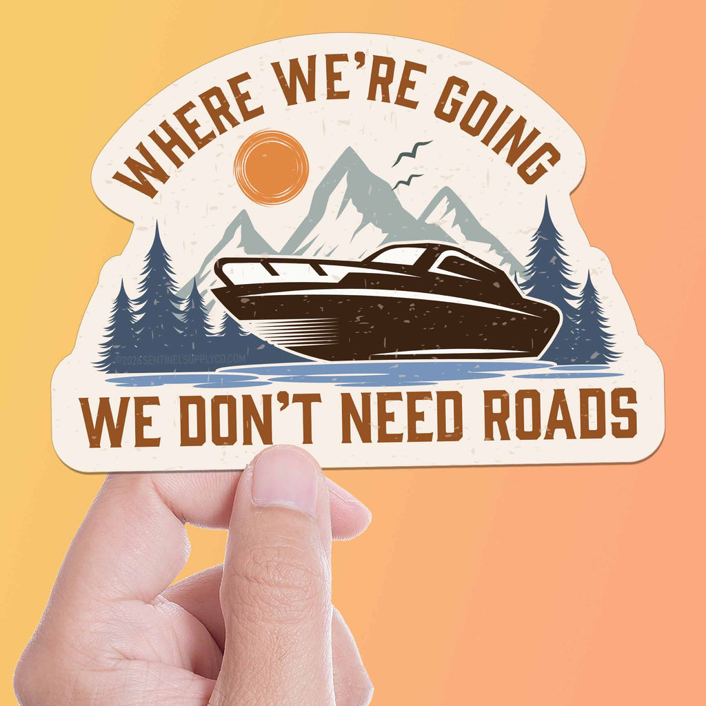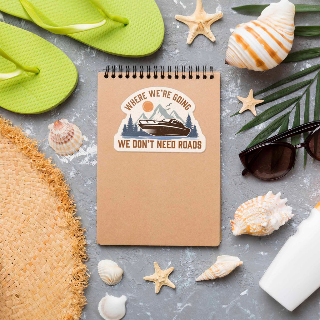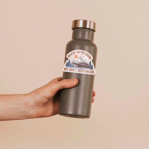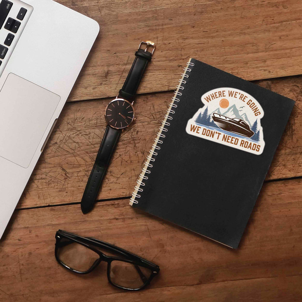 "Where we're going, we don't need roads!" This famous 80s movie quote applies not only to sports-car time machines, but to boaters, fishing lovers, and explorers of all kinds. This funny outdoor sticker features a boat on a lake surrounded by mountains and forests, a great reminder that some of life's best moments happen when you're lost in the great outdoors.